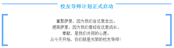 传承是共同的心愿,进取是我们不变的精神。我们欢迎更多校友加入我们的校友导师计划,大家齐心协力,为新一代萨里学子的成长、为萨里精神的发扬光大奉献更多的热枕、智慧和行动!