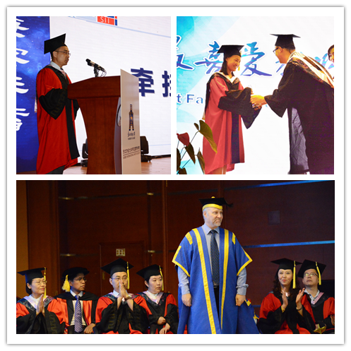 在全体齐唱国歌之后,由史达副院长首先致辞。他表达了对2017届全体毕业生的祝贺,并以数字“7”教导毕业生们学会感恩,在毕业后依然不忘初心。随后,副院长Gary Rivers博士代表英国萨里大学表达了对莘莘学子的祝贺,并鼓励他们能够在这个瞬息万变、高速发展的时代中坚持不懈地追求自己的梦想,以卓越的能力回馈社会。萨里国际学院旅游管理专业教师石芳芳博士荣获“毕业生心中最喜爱的教师”称号,她在发言时回顾毕业生一路走来的岁月,“凡事乐观,勇往直前”是她送给毕业生们最好的礼物。