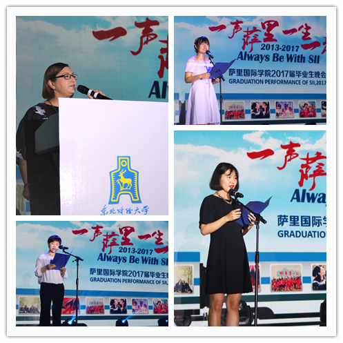 2017年6月20日18:30科学报告厅内毕业生晚会如期而至。本场毕业生晚会分为四个篇章:“一”眼瞬间、“三”生有幸、“一”生有你、“七”待重逢。每个篇章开始前分别由毕业生代表陈姝宇同学、教师代表Cheryl Taylor、毕业生家长代表张欣妈妈及2013级工商管理专业辅导员陆远老师以阅读书信的方式,从学生、老师、家长和辅导员不同的角度表达对毕业生们大学四年的感悟和离别时嘱托。