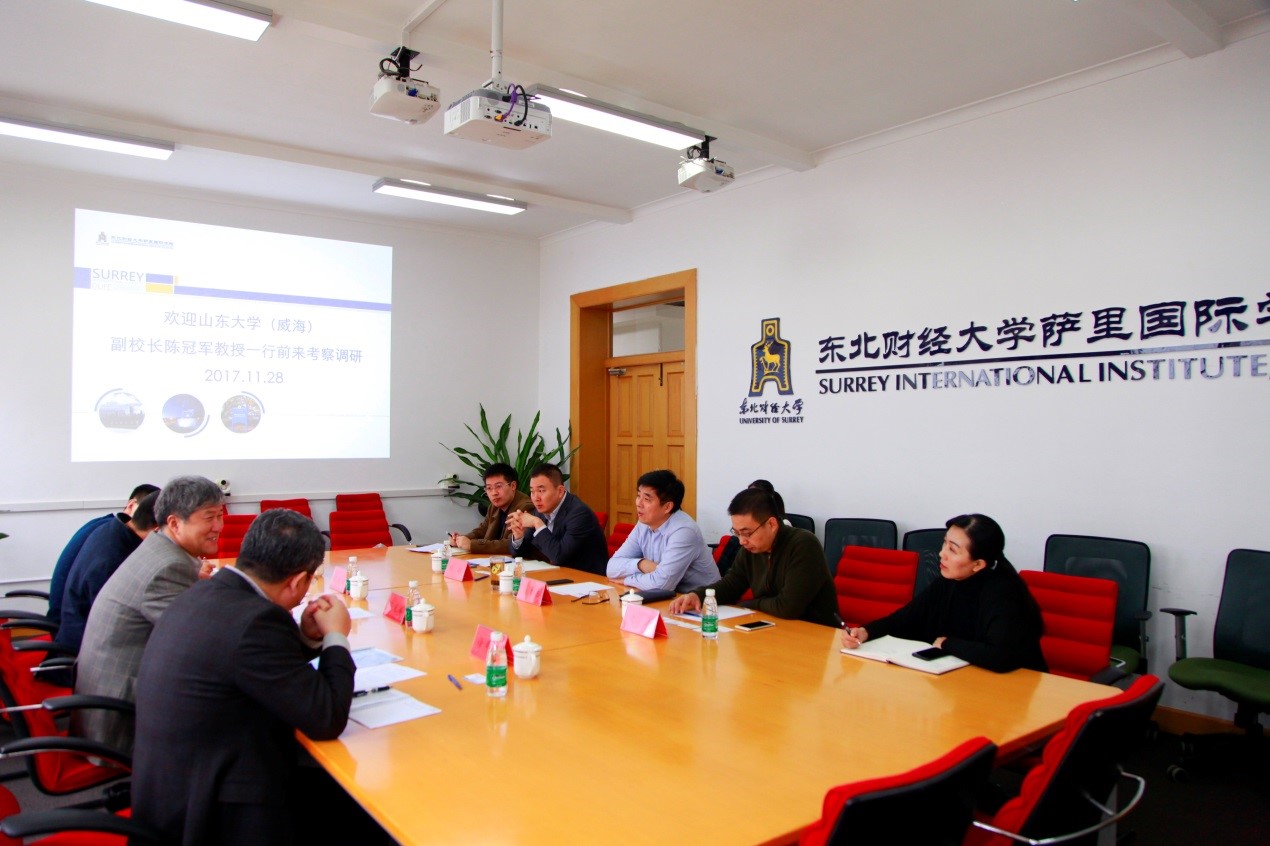 2017年11月28日,山东大学(威海)副校长陈冠军教授一行4人访问萨里国际学院。东北财经大学副校长赵彦志教授,萨里国际学院 旅游与酒店管理学院副院长(主持工作)史达教授、副院长陶硕在砺金楼210会议室会见来宾一行并进行座谈交流。
