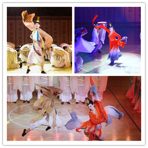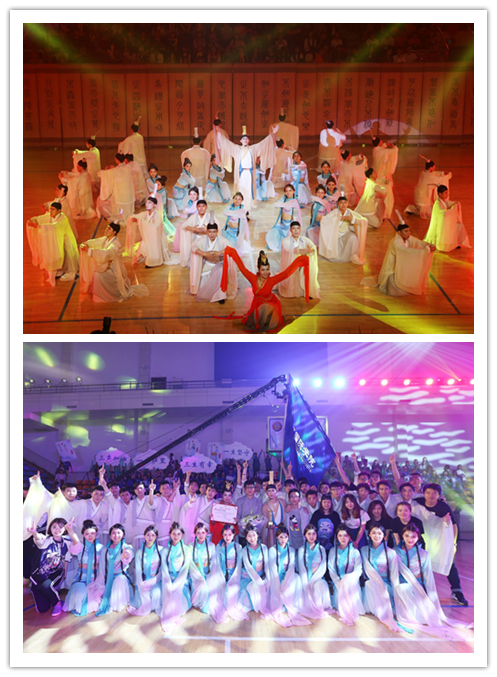 我院参赛队伍演绎的舞蹈名为《礼韵中华》,它脱胎于舞剧《孔子》。古风装束的演员们将绚烂扰攘的体育馆沉静下来,时空瞬间闪回到春秋时代,舞蹈将孔子的理想向大家娓娓道来。第一个篇章是书简舞,孔子着浅棕色长衫跳跃翻腾入场,凌空纷飞的衣纱轻盈缥缈,搅动了一个时代的瑰丽思想。紧接着,众多白衣弟子追随着夫子,坚定迈步而来,舞动洁白长袖,似雪又似书页般纯净。而夫子与众多学生的互相作揖更是将气氛推向小高潮,呈现出孔子理想中安定而乐学的社会,书香缭绕。第二篇章是采薇,采薇取自诗经,展现了民间女子采撷薇菜的情景,朴实而又欢乐,象征平静富足的百姓生活。随着“昔我往矣,杨柳依依。今我来思,雨雪霏霏”空灵的伴唱,蓝衣采薇少女们款款而至,一肌一容,尽态极妍。少女们摆动腰肢,水袖随其动作而翩然飞舞,行云流水,如烟似梦。第三个篇章是玉人,舞台上,玉人头戴金簪,一袭红色衣裙,美艳不可方物。玉人二度侧身飞旋,殷红水袖掠过一排鼓面,溅起晶莹光华。红纱尚在空中飞扬,她再度以侧翻技惊四座,瞬间引爆掌声欢呼雷动。“君子无故,玉不去身”。舞蹈以玉赞人,展现出君子应有的品质。第四篇章是执羽舞,讲述了孔子的思想为弟子们所吸收传承,这是孔子期望的。舞蹈近尾声处,《论语》金句的吟诵余韵悠长,将整个舞剧推向高潮!
