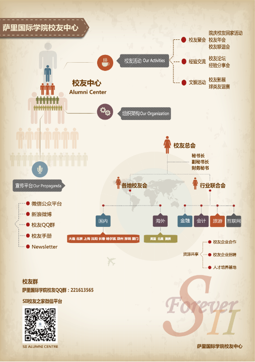 萨里国际学院校友中心一方面致力于校友间的经验交流,如定期举办校友论坛、经验交流会和校友导师计划等活动,另一方面开展文娱活动,如:校友影展、球类友谊赛等特色活动。此外,校友中心设立了SII校友小管家,起到了维护微信公共平台和30个校友群的作用。