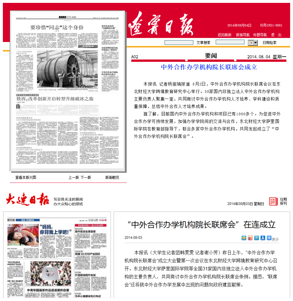 2014年8月2日上午,由我院联合中国科学院大学中丹学院、同济大学中德工程学院、华中科技大学中欧清洁与可再生能源学院、中国政法大学中欧法学院等九家非独立法人中外合作办学机构发起设立的中外合作办学机构院长联席会成立大会暨第一次会议在东北财经大学跨境教育研究中心召开。瞭望东方周刊、中国教育报、辽宁日报、大连电视台等9家媒体参会并报道。